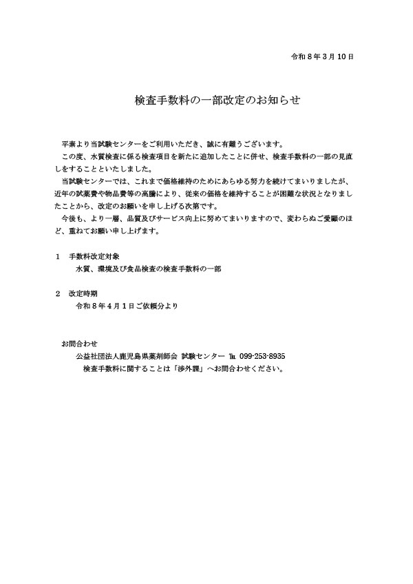 検査手数料の一部改定のお知らせ